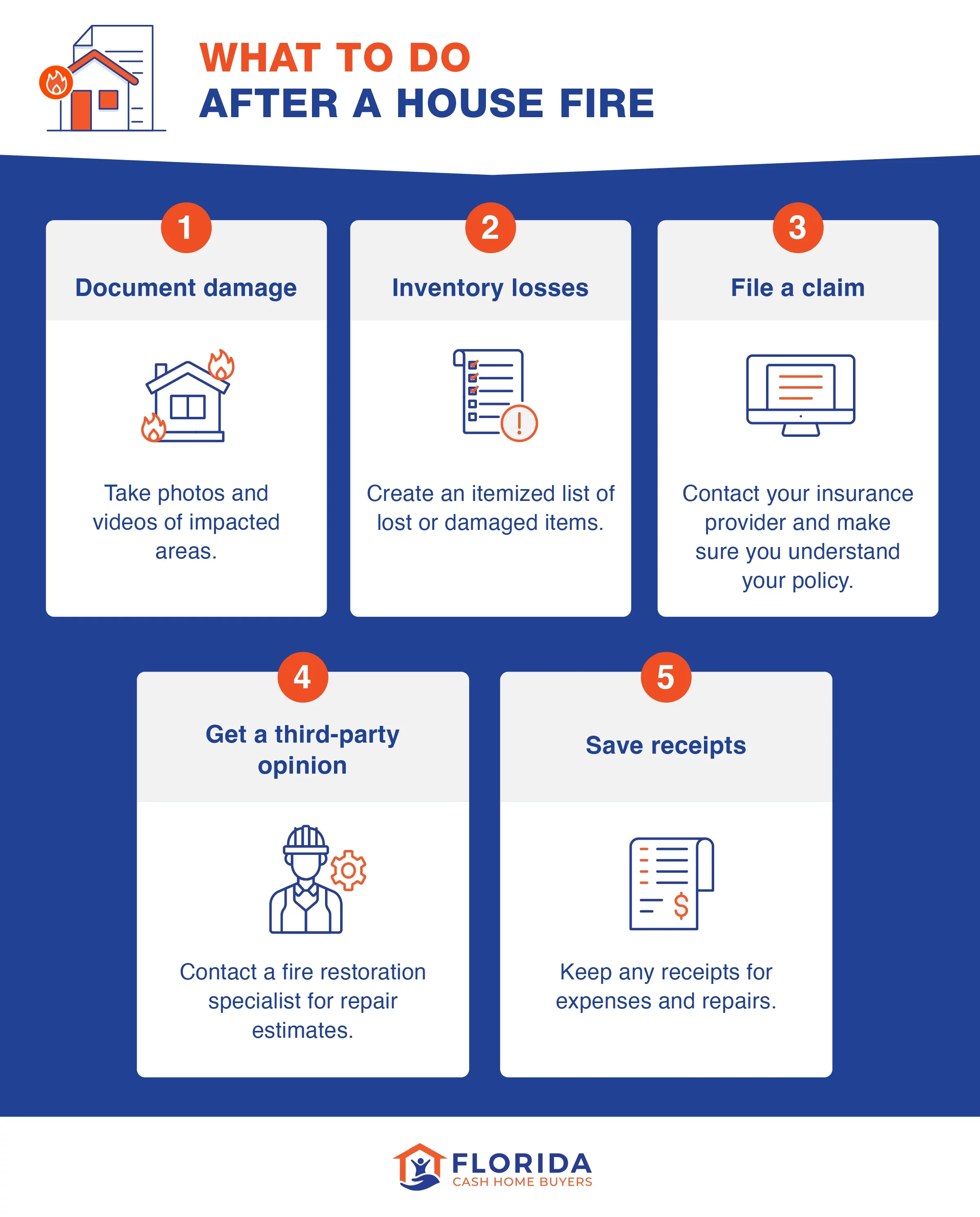 - Florida Department of Financial Services: DFS can provide guidance on how to file an insurance claim. They can also advise on how to choose between the different options they have with a fire-damaged home.